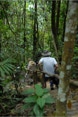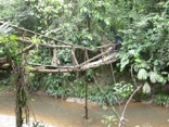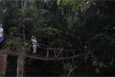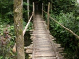 We slipped and skidded our way back down the embankment. On our way to the parking lot, we heard BLUE-CROWNED MOTMOT calling. After instructing Niko which bags should remain on the bus, we were led down a precipitous winding trail comprised of a series of steep steps carved into a slope. At the bottom of the trail we encountered a narrow wobbly wooden bridge, which crossed the Río Gareno. The one hard and fast lodge rule about the bridge: only one person cross at a time. And oh, yes, - don’t lean too hard (or at all!) on the railing.