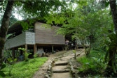 With everyone safely across, the remainder of the hike to the lodge wasn’t long. The main lodge building was a two-story wooden structure raised on pilings. It housed a kitchen, a large open area for dining and wildlife observation, and an upper level where family/staff lived. All of this was open air – no windows or screens.