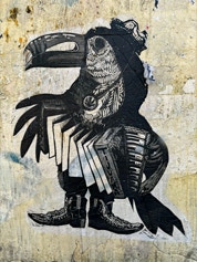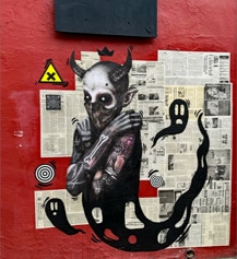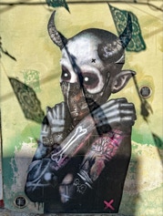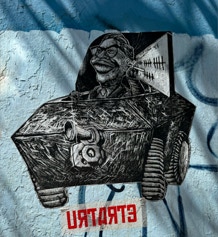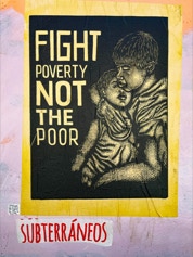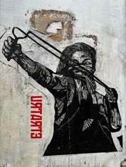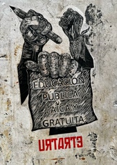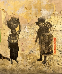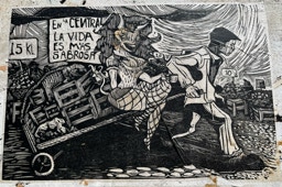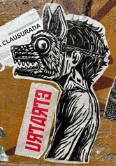 Street artists employ a range of techniques and materials that fit their ideologies. The Revolutionary Union of Art Workers (URTARTE) use wood block prints that are applied to biodegradable rice paper with a traditional press. Multiple copies are made and quickly applied to structures using wheat paste. This allows for an application that doesn’t damage historic buildings. As politically charged pieces are removed by the city, additional prints can swiftly take their place.