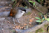 Pushing on we came to a small covered viewing station. Similar to our 2008 visit to Angel Paz’s to see antpittas, our “antpitta” guide at Tapichalaca, Miguel, used the same technique to lure in “Pancho”, the nickname given to the male Jocotoco Antpitta. “Venga, venga, venga, Poncho!”, Miguel called out as he dropped cut-up mealworms on the trail. Within a few minutes, Pancho crept (hopped) out of the jungle. Oblivious to clicking camera shutters, Pancho downed the worms within four feet of us. Pancho’s mate “Vivi” has been known to make appearances but this morning it would be one of the recently hatched chicks, a now nearly adult bird.
