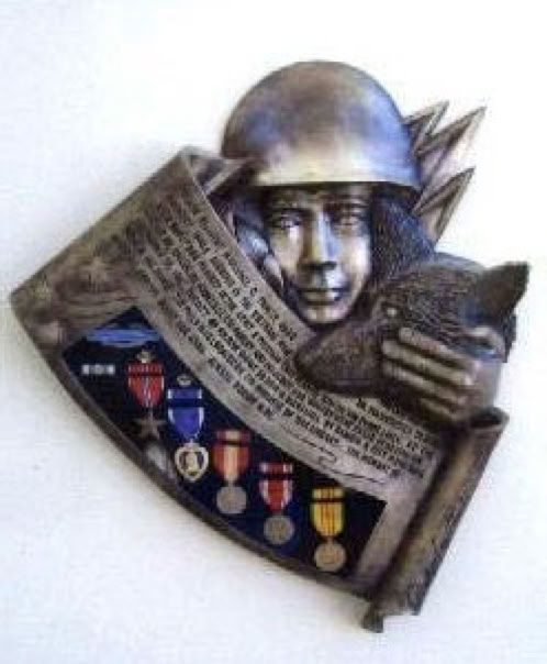Just inside the library there is a bronze relief featuring Marshall Colin Farley, his scout dog Bootsy, along with Marshall’s military decorations. The relief had been unveiled earlier in the year when the library was dedicated in February. Marshall’s brother, Michael and other family members, were on hand for the dedication.