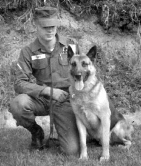 In November 2005, Bill Riley, a former scout dog instructor at Ft. Benning, wrote and shared a few photos. Pictured above are Bill and King, his sentry dog on Okinawa (‘66). In 1966 Bill was sent back to the states to help reactivate the 26th IPSD and train new handlers. Eventually Bill became a senior instructor and NCOIC of the demonstration team. The demo dog was named Dan. Dan had a reputation for loving to dig holes if you said, “Where’s the bug, Dan?”. (check out the Benning photo album for a snapshot of Bill and Dan)