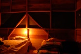 Based on descriptions we had of Gareno Lodge, the words “primitive” and “rustic” rang true. Candles and matches replaced electric lights. Cottage furnishings included wooden platform beds with comfortable mattresses and clean linen. A rough hand-hewn wooden night stand and similarly fashioned table rounded our the furnishings. In a word, spartan.