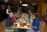 It took the staff several trips up and down the steep trail to finish hauling our luggage from the bus. Thank goodness we had thought to take Steve and Rita’s lead on reducing the number of bags needed. When all our bags were staged in the main lodge, we were assigned our cottages. These were located further from the main building, across another wooden foot bridge, and on either side of a trail constructed of wooden planks laid down to minimize walking in mud when it rained. Staff sorted and delivered bags to our assigned cottages. By now, nightfall had descended and we could fully appreciate Richard’s warning about not having to do all of this in the dark!