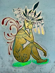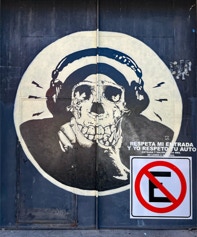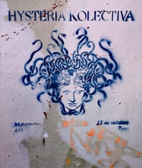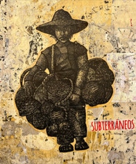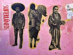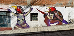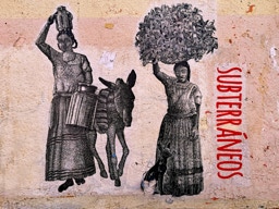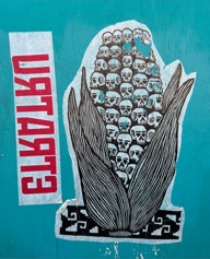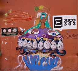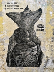 Lapiztola is a collective that creates vibrant, layered works with stencils and paint. Their graphics are typically focused on the indigenous identity of Oaxaca. Images of corn are included in order to show respect for the local domestication of this food source. The paliacate is also present in their designs – a bandana that’s associated with the strength and resistance of the Zapatista revolutionary movement.